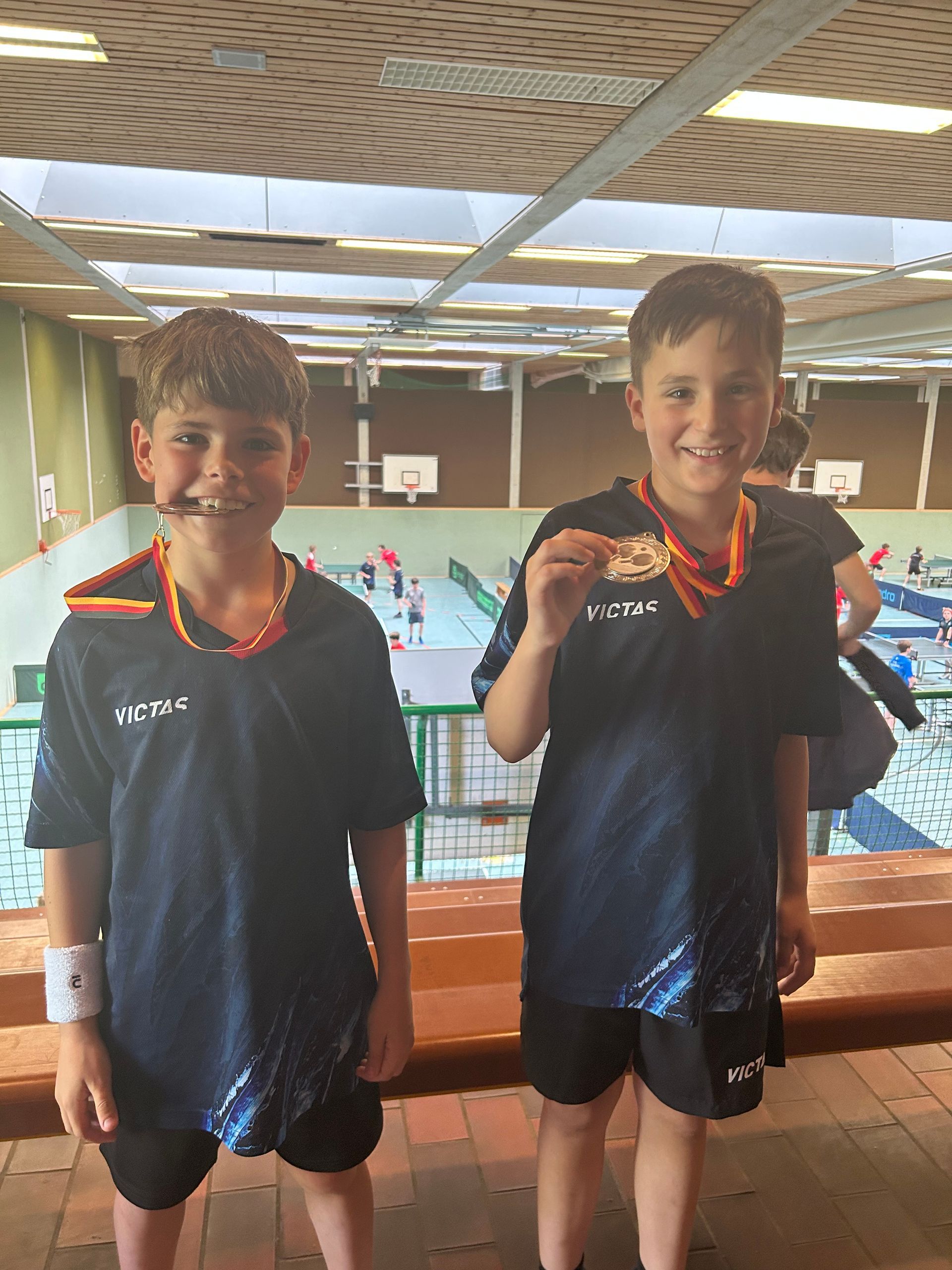 Am 17.05.2025 ging es für einige Geyener zum Sichtungsturnier nach Kerpen. Morgens um 08:30 Uhr trafen sich Amar, Marc, Henri S., Henri M., David, Torben, Jakob F., Jakob N., Bjarne und Liam, um sich auf den Weg nach Kerpen zu machen. Um sich dort mit knapp 120 anderen in verschiedenen Leistungsklassen bis 850TTR-Punkte zu messen. Mittag kamen dann noch für die Leistungsklassen ab 850TTR-Punkte Leo, Jakob und Toby dazu. Erstmals spielten wir in unseren neuen Trikots und man kann jetzt schon sagen, sie sehen nicht nur verdammt cool aus, sondern bringen auch den Erfolg wieder mit nach Geyen. Bei 13 Startern konnten wir fünf Platzierungen in den Top 5 der jeweiligen Leistungsklassen verzeichnen. Hier ist mal ein GROSSES DANKESCHÖN an unser Trainierteam fällig. Sie scheinen gerade irgendwas richtig zu machen. Amar holte in seiner Klasse den 2. Platz und schlug im Laufe des Turniers nicht nur den letztjährigen Sieger sondern sicherte sich mit dem Einzug ins Finale die Qualifikation für die Bezirksendrangliste (Jahrgang 2015)!!! Ehrlicherweise hatte ich Henri S. nicht direkt auf den Schirm, wo es darum ging wer hier heute was gewinnen könnte. Aber mit seinem 3. Platz zeigt Henri nicht nur mir sondern auch dem Bezirk wozu er in der Lage ist. Das er sich stetig verbessert, konnte man bereits im Training beobachten. Glückwunsch an die beiden Medaillengewinner!!! (Bild: v.l. Henri, Amar) Die weiteren Top 5 Platzierungen konnten sich Toby und Leo mit jeweils dem 4.Platz sichern, beide sind mit einer besseren Bilanz hinter den punktgleichen 2&3 eingestuft worden. Hier wurde nach TTR-Wert der Gegner gewertet. Mit dem 5.Platz konnte Jakob N. überzeugen. Für Ihn war es sein aller erster Einsatz in einem Punktspiel! Mit so einem Start kann man mehr als zufrieden sein. Zu erwähnen sind noch Henri M., Emilian und Torben diese konnten Ihre ersten Siege in einem Punktspiel einfahren, gerne mehr davon. ;) Alle weiteren Teilnehmer haben ebenso gute Spiele gezeigt auch wenn es an der ein oder anderen Stelle noch nicht für eine bessere Platzierung gereicht hat. Euer Jugendleiter